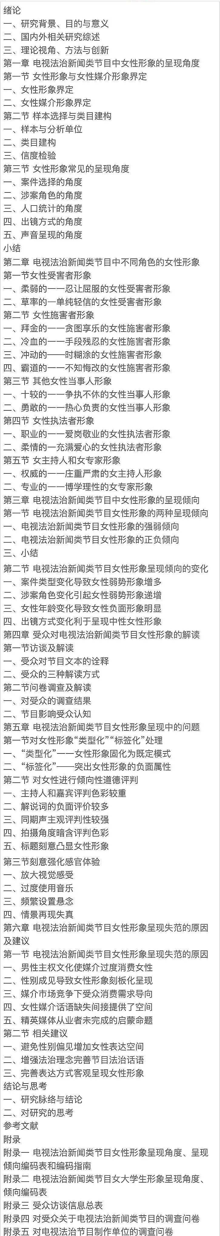由此,本書對電視法治新聞類節(jié)目對女性形象的呈現(xiàn)角度、呈現(xiàn)類型、符號運用等方面加以研究,回答了電視法治新聞類節(jié)目對女性如何呈現(xiàn)、呈現(xiàn)的角度、呈現(xiàn)的傾向以及呈現(xiàn)的方式,指出其中存在的問題并探討成因。