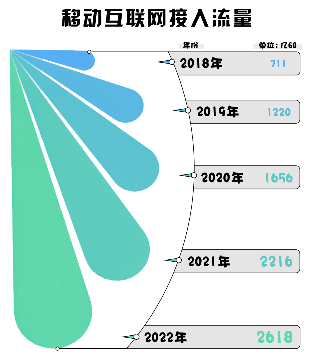 移動互聯(lián)網(wǎng)是移動通信、互聯(lián)網(wǎng)二者的結(jié)合體,通過移動互聯(lián)網(wǎng),人們可以地鐵上使用手機(jī)、平板電腦等移動終端瀏覽新聞、刷短視頻等。2022 年,我國移動互聯(lián)網(wǎng)接入流量達(dá) 2618 億 GB,同比增長 18.1%。