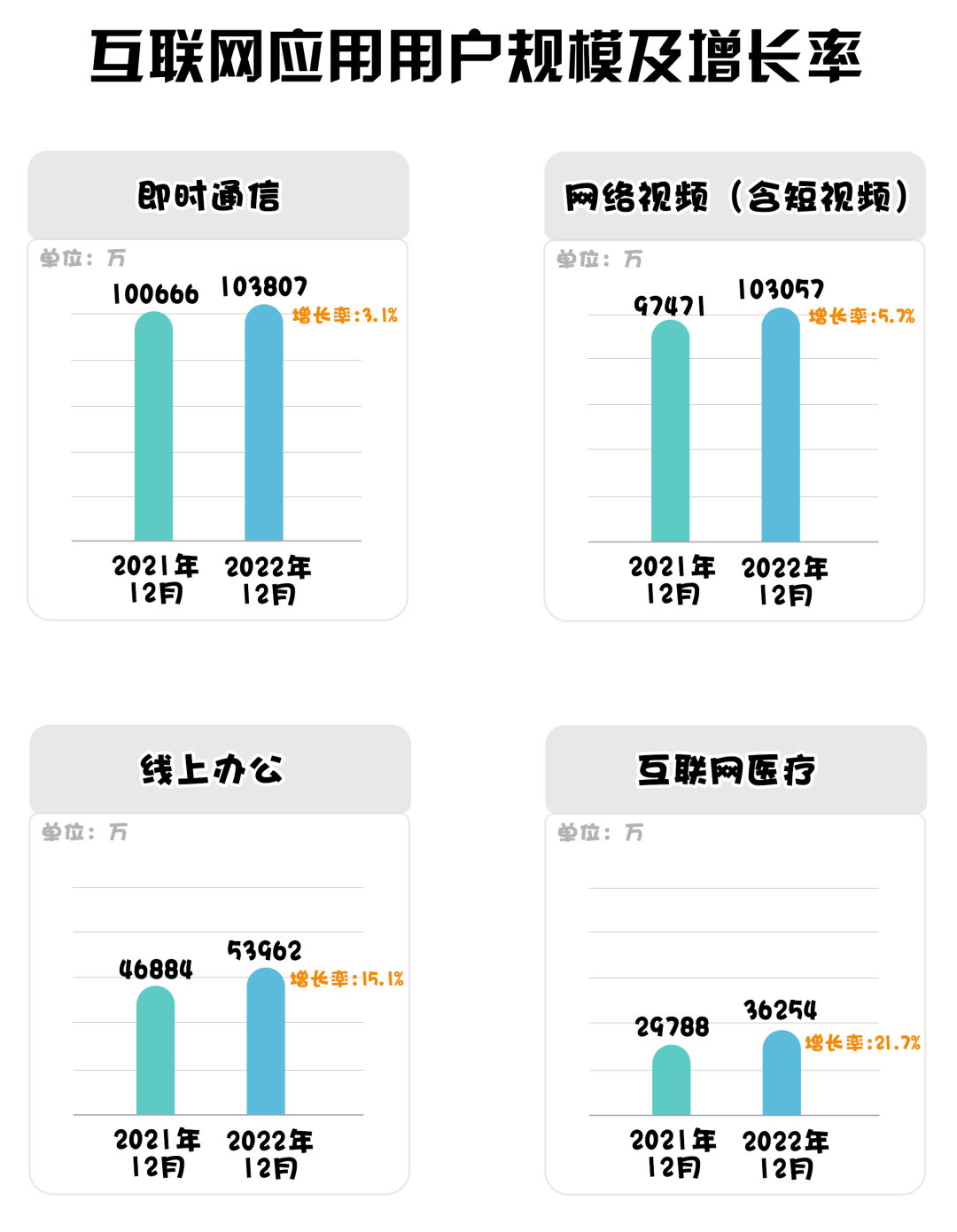 2022 年,我國各類個(gè)人互聯(lián)網(wǎng)應(yīng)用持續(xù)發(fā)展。即時(shí)通信的用戶規(guī)模保持第一, 較 2021 年 12 月增長 3141 萬,使用率達(dá) 97.2%;網(wǎng)絡(luò)視頻(含短視頻)用戶規(guī)模達(dá)10.31億,其中短視頻用戶規(guī)模達(dá)10.12億;互聯(lián)網(wǎng)醫(yī)療、線上辦公的用戶規(guī)模 較 2021 年 12 月分別增長 6466 萬、7078 萬,增長率分別為 21.7%、15.1%。