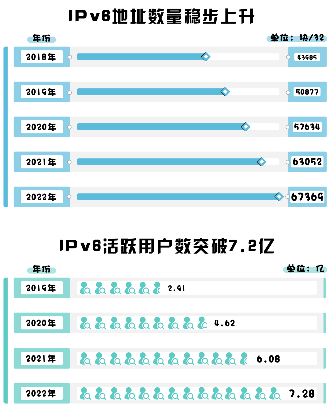 根據(jù)《報(bào)告》顯示,截至2022年12月,我國IPv6地址數(shù)量達(dá)到67369塊/32,連續(xù)5年遞增;IPv6活躍用戶達(dá)到7.28億,相較2021年增長1.2億。
