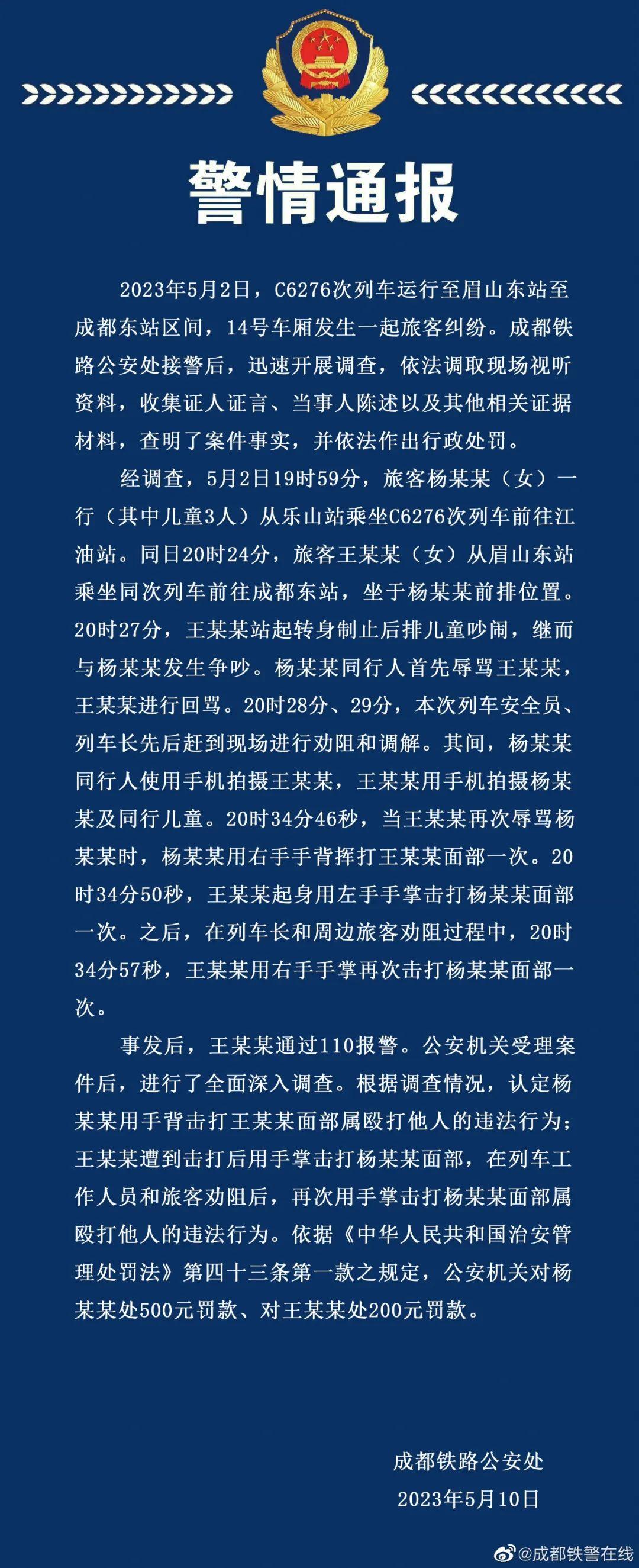 面對(duì)網(wǎng)絡(luò)質(zhì)疑,5月10日,成都鐵路公安處官方微博“@成都鐵警在線”發(fā)布警情通報(bào)稱,根據(jù)調(diào)查情況,認(rèn)定楊某某用手背擊打王某某面部屬毆打他人的違法行為;王某某遭到擊打后用手掌擊打楊某某面部,在列車工作人員和旅客勸阻后,再次用手掌擊打楊某某面部屬毆打他人的違法行為。警方據(jù)此認(rèn)為雙方均違反治安管理處罰法,并處以不同金額的罰款。隨后,四川廣播電視臺(tái)“@四川觀察”、封面新聞公布現(xiàn)場(chǎng)視頻,涉及列車車廂監(jiān)控、列車長(zhǎng)巡檢記錄儀、當(dāng)事雙方手機(jī)所拍視頻等多個(gè)角度,直觀地呈現(xiàn)雙方發(fā)生爭(zhēng)執(zhí)繼而爆發(fā)肢體沖突的過程。網(wǎng)絡(luò)討論熱度再次攀升,微博上形成“#高鐵掌摑事件雙方曾多次對(duì)罵#”“#高鐵被打女子2次打人被認(rèn)定違法#”“#王某某被打后兩次掌摑楊某某#”等多個(gè)話題,不少網(wǎng)民一改之前支持王某某的立場(chǎng)。但部分網(wǎng)民仍從情感角度出發(fā),質(zhì)疑官方對(duì)視頻進(jìn)行二次剪輯,認(rèn)為警方苛求被打者還擊的間隔時(shí)間有失公平。