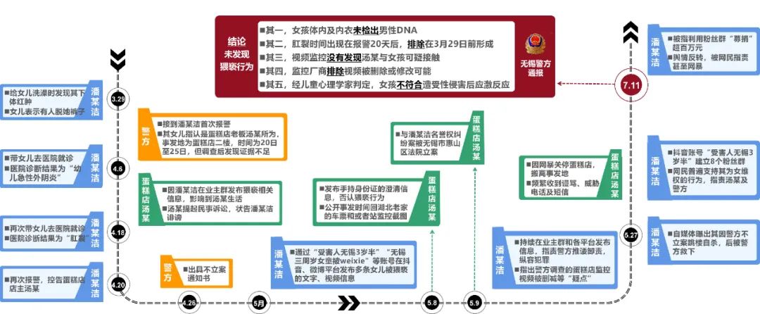 面對巨大的輿情壓力,7月11日,無錫市公安局發(fā)布通報(bào),詳述調(diào)查過程,包括DNA檢測、肛裂原因排除、視頻監(jiān)控核查、心理學(xué)家判定等內(nèi)容。通報(bào)全文800余字,邏輯清晰、內(nèi)容詳實(shí),“不存在猥褻行為”這一結(jié)論獲得輿論認(rèn)可,“#警方通報(bào)無錫3歲女童事件調(diào)查結(jié)果#”等微博話題閱讀量累計(jì)近6億。至此,輿情反轉(zhuǎn),多數(shù)網(wǎng)民指責(zé)潘某潔虛構(gòu)事實(shí)、利用女兒造謠污蔑,呼吁依法對其嚴(yán)懲。