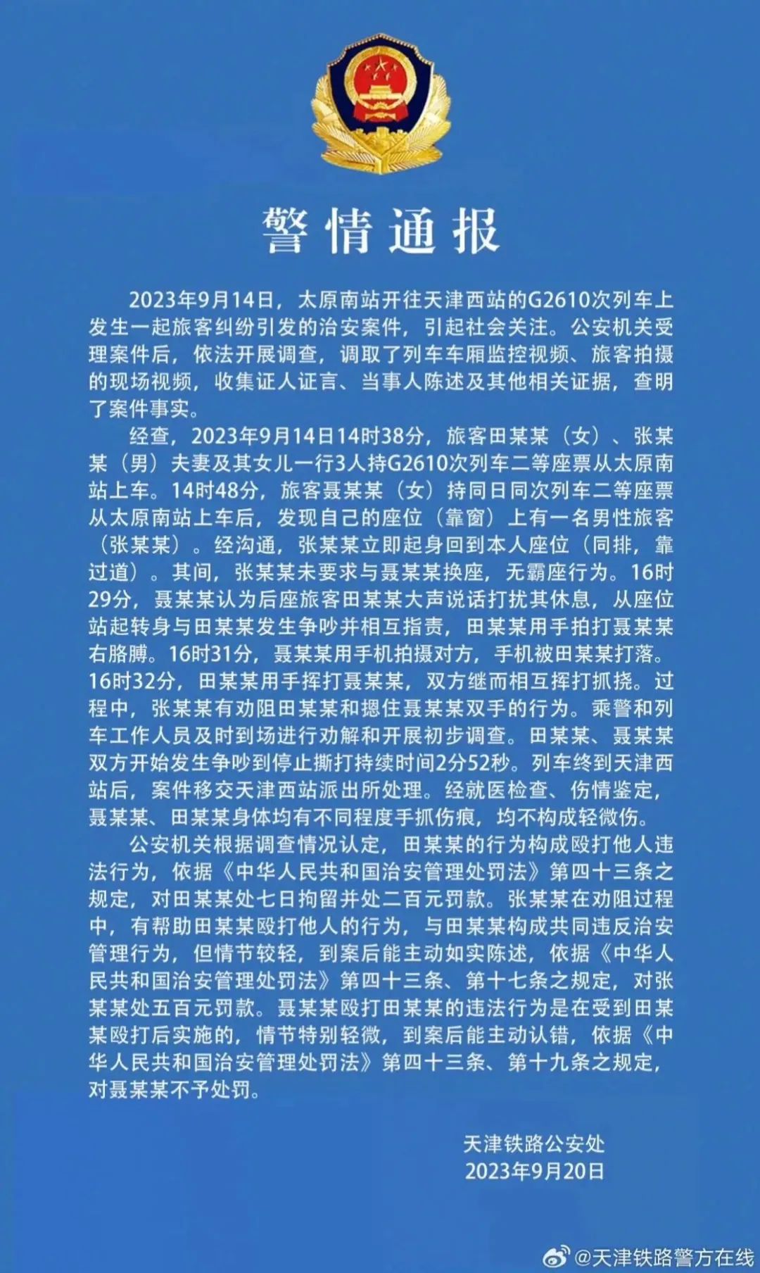 數(shù)日后,事件迎來動(dòng)態(tài)進(jìn)展。9月20日,天津鐵路公安處再次發(fā)布詳細(xì)通報(bào),還原了事發(fā)過程,表示雙方矛盾系因口角糾紛引發(fā),不存在霸座行為,雙方均不構(gòu)成輕微傷,田某某有毆打他人違法行為,將其拘留七日并罰款200元,張某某勸阻過程中幫助田某某毆打他人,被處以500元罰款,聶某某的毆打行為是在受到田某某毆打后實(shí)施的,因情節(jié)特別輕微且主動(dòng)認(rèn)錯(cuò)不予處罰。網(wǎng)民認(rèn)可通報(bào)內(nèi)容,稱“原來如此”,贊官方處理得當(dāng)。