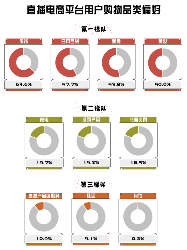 根據(jù)微播易、蟬媽媽等聯(lián)合發(fā)布的《2023年中國(guó)直播電商機(jī)會(huì)洞察報(bào)告》顯示,直播電商平臺(tái)用戶購(gòu)物品類偏好中,美食位列第一梯隊(duì),占比達(dá)到53.8%,反映了公眾對(duì)食品消費(fèi)從吃得飽到吃得好的轉(zhuǎn)變。