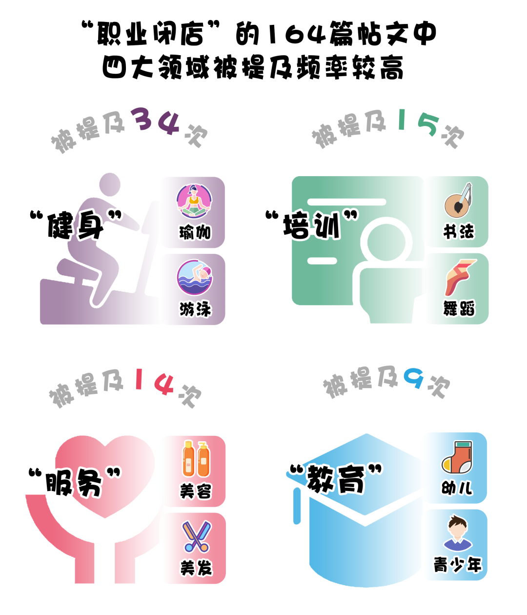 以“職業(yè)閉店”為關(guān)鍵詞,在小紅書(shū)選取164篇相關(guān)帖文,對(duì)帖文內(nèi)容進(jìn)行行業(yè)分類(lèi)統(tǒng)計(jì)后發(fā)現(xiàn),“健身”“培訓(xùn)”“服務(wù)”“教育”成為消費(fèi)者吐槽頻次最高的四個(gè)預(yù)付式消費(fèi)領(lǐng)域。