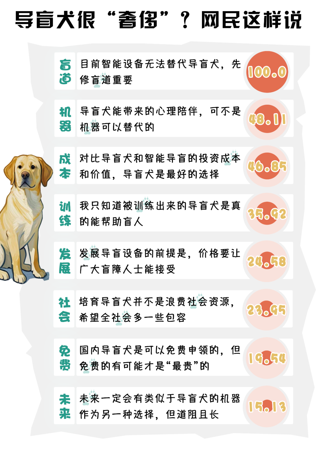 數據顯示,培訓一條導盲犬的成本約20萬元,有人戲稱其是“奢侈品”。其實,導盲犬是免費給視障人士使用的,其養(yǎng)護、醫(yī)療等成本與寵物犬相差并不大。輿論場中,網民對于導盲犬的價值討論呈現(xiàn)截然不同看法。