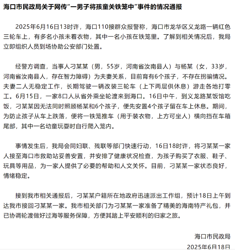 6月18日凌晨,據(jù)微信公眾號“??诎l(fā)布”消息,海口市民政局通報稱,河南汝南縣人刁某某與有智力障礙的妻子楊某育有6子,無拐騙;夫妻二人無穩(wěn)定工作,長期駕駛一輛改裝三輪車游走各地打零工;因無力看管,刁某某把鐵籠擋在車尾防跌落,幼童玩耍時自行爬入。刁某某一家人已被接至救助站安置,18日將被戶籍地政府工作組接回。另據(jù)福建電視臺“第一幫幫團”欄目消息,汝南縣婦聯(lián)回應(yīng)稱,雙方已結(jié)婚多年,各部門正在協(xié)調(diào)制定方案,會對孩子幫扶。官方的積極回應(yīng)和作為緩和網(wǎng)民情緒,輿論關(guān)注轉(zhuǎn)到未成年人權(quán)益保障方面,湖北經(jīng)視《經(jīng)視直播》欄目關(guān)注孩童的受教育權(quán)、生命健康權(quán)是否得到保障,認(rèn)為當(dāng)?shù)夭块T有必要介入評估這對父母是否具有撫育能力,視情干預(yù);部分網(wǎng)民希望地方政府完善救助體系,保障幼童合法權(quán)益。截至6月26日12時,相關(guān)信息5.2萬余條,“#??诙嗝嗦阌淄桓赣H關(guān)車斗鐵籠#”等微博話題閱讀量累計超1.1億。