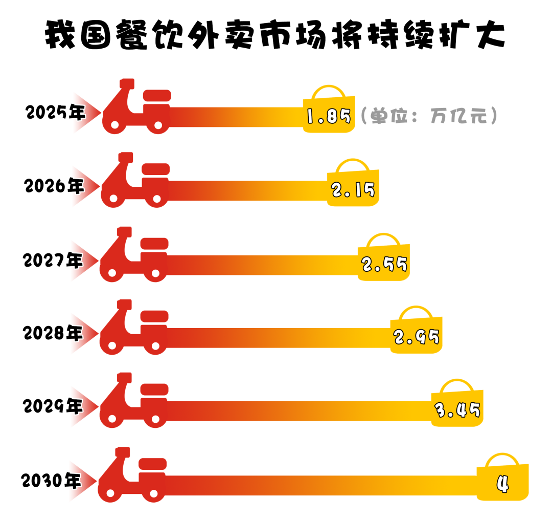 以外賣市場(chǎng)中的餐飲業(yè)為例,數(shù)據(jù)顯示,未來幾年,預(yù)計(jì)我國餐飲外賣市場(chǎng)規(guī)模將顯著增長,將從2025年的1.85萬億元一路攀升至2030年的4萬億元。這一持續(xù)拓寬的商業(yè)藍(lán)海,引得各家外賣平臺(tái)摩拳擦掌,“外賣大戰(zhàn)”不時(shí)打響。
