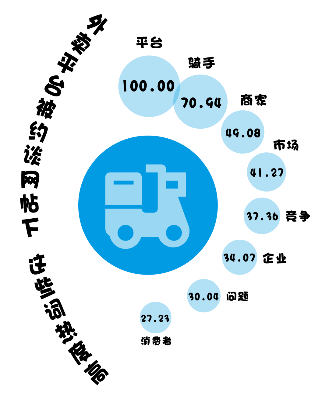 (數(shù)據(jù)來源:選取知乎話題“市場(chǎng)監(jiān)管總局等五部門約談京東、美團(tuán)、餓了么等外賣平臺(tái)企業(yè),釋放了什么信號(hào)?”下的659個(gè)回答,做分詞及歸一化處理,進(jìn)行分詞后將熱度最高的詞語規(guī)定為100)