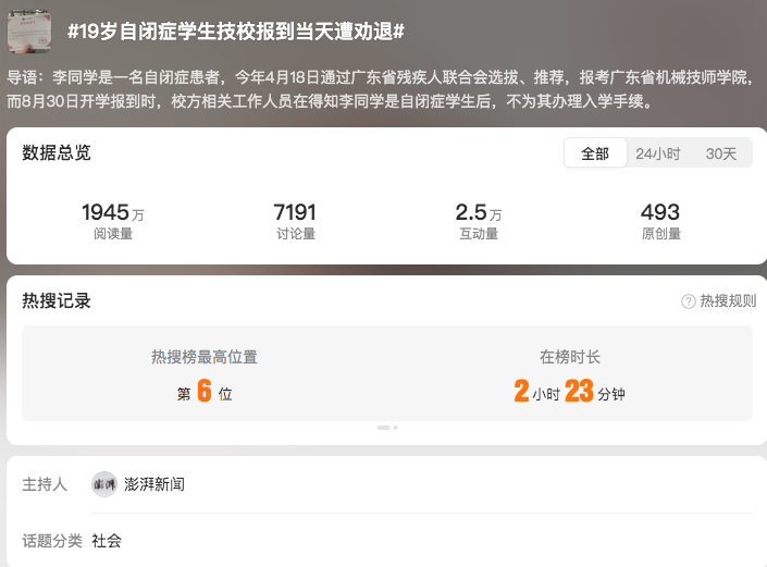 9月9日,澎湃新聞采訪相關(guān)方首發(fā)報(bào)道,當(dāng)事同學(xué)父親認(rèn)為,校方的審核、錄取程序存在諸多疏漏,直至入學(xué)報(bào)到當(dāng)天才說不予接收,讓學(xué)生錯(cuò)失了報(bào)讀其他學(xué)校的機(jī)會(huì)。廣東省機(jī)械技師學(xué)院宣傳部相關(guān)負(fù)責(zé)人回應(yīng)稱,學(xué)校確實(shí)向該同學(xué)發(fā)放錄取通知書,但該殘疾人招生項(xiàng)目主要面向肢體殘疾和言語殘疾學(xué)生,面試時(shí)校方教師對該同學(xué)患有自閉癥并不知情。因擔(dān)心對學(xué)校正常學(xué)生造成影響,建議其找其他合適的學(xué)校就讀。該報(bào)道發(fā)布后,齊魯晚報(bào)、上游新聞、極目新聞等媒體跟進(jìn)轉(zhuǎn)載,輿情開始發(fā)酵,#19歲自閉癥學(xué)生技校報(bào)到當(dāng)天遭勸退#微博話題登上熱搜榜第6位。