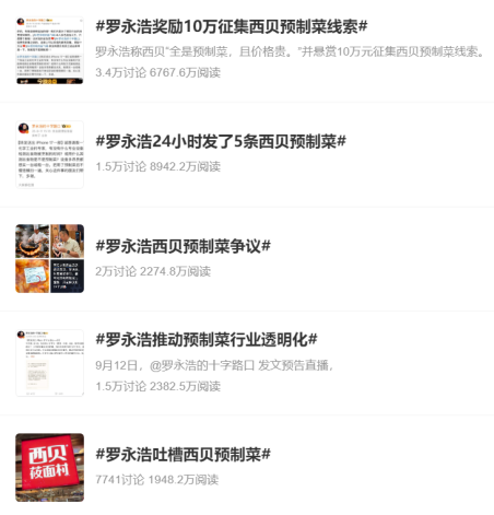 回溯這場討論的源頭,始于羅永浩的一篇微博。9月10日下午,“@羅永浩的十字路口”發(fā)博稱,“好久沒吃西貝了,今天下飛機(jī)跟同事吃了一頓發(fā)現(xiàn)幾乎全都是預(yù)制菜,還那么貴,實(shí)在是太惡心了。希望國家盡早推動立法,強(qiáng)制飯館注明是否用了預(yù)制菜?!碧陌l(fā)出后迅速引起網(wǎng)民關(guān)注。