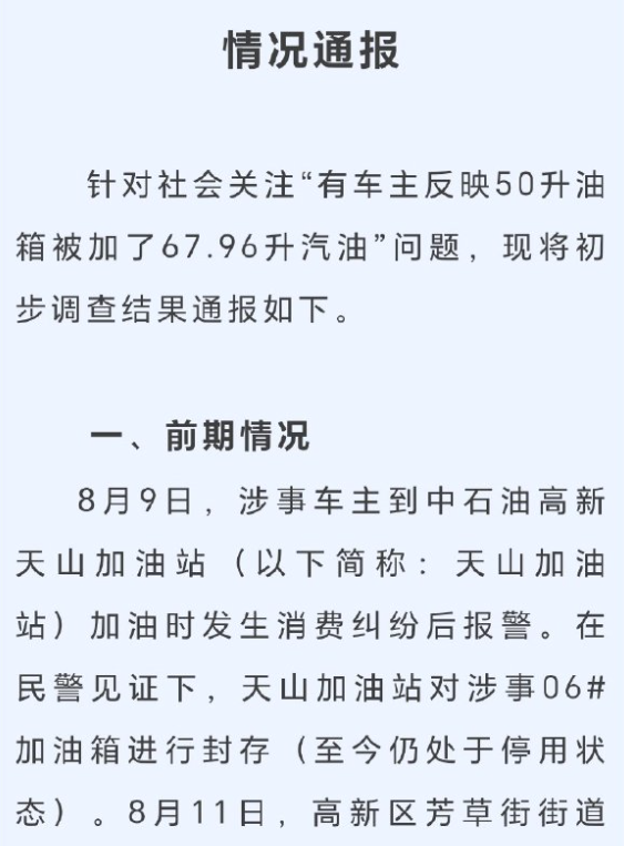 據(jù)澎湃新聞8月20日報道,8月9日,車主楊某駕駛油箱總?cè)萘?0升的小車,在成都市中石油錦華天山站加油,油箱顯示為其加注了67.96升汽油。楊某提出異議后,加油站表示只認油槍數(shù)據(jù),堅持按67.96升收費,楊某最終結(jié)賬離開。結(jié)賬離開前,楊某先后向公安機關、市監(jiān)局、12345熱線等多部門投訴,并要求加油站封槍。三天后,加油站一負責人以私人名義將多收的錢退給楊某,希望其同意油槍解封,但解封后加油站沒有給出過任何解釋。在“問政四川”平臺上,成都市高新區(qū)管委會回復“將在15個工作日詳細回復”;高新區(qū)市場監(jiān)督管理局綜合執(zhí)法部門工作人員表示,有了進展辦案人員會聯(lián)系投訴人。部分自媒體和網(wǎng)民圍繞事件原因進行討論,要求官方給出一個透明、準確的調(diào)查結(jié)果。深圳廣電集團都市頻道“@第一現(xiàn)場”還評論稱,“監(jiān)管部門不應沉默”。