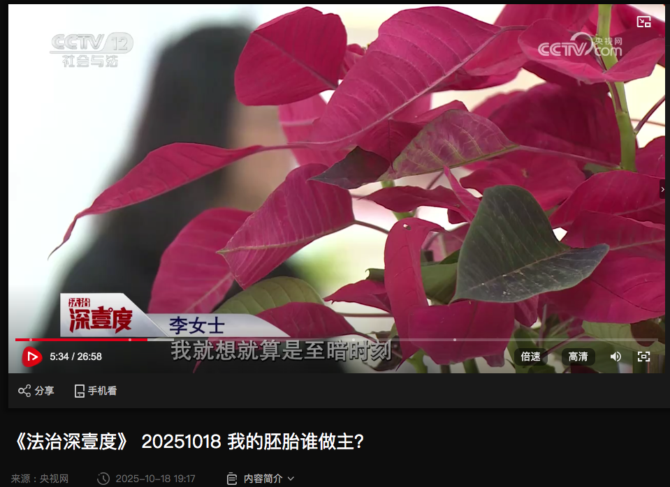 10月18日,央視社會與法頻道《法治深壹度》節(jié)目播發(fā)專題報道《我的胚胎誰做主?》,報道一起喪偶婦女輔助生殖權益案。據(jù)介紹,福建李女士在丈夫不幸去世后,希望利用夫妻二人在醫(yī)院冷凍保存的胚胎繼續(xù)實施移植手術,但醫(yī)院鑒于醫(yī)學倫理問題拒絕了她的請求。隨后李女士將醫(yī)院起訴至法院,一審和二審均被駁回。直至2022年6月,福建省高級人民法院再審認為,李女士要求醫(yī)院為其實施胚胎移植手術生育二胎有充分的法律依據(jù),并且還能在精神上撫慰雙方的老人,最終判決醫(yī)院繼續(xù)履行合同,為李女士實施胚胎移植手術。該報道采訪到李女士本人、醫(yī)院代理律師、法學專家及法官,全面回顧李女士個人遭遇、情感動機以及案件背后的法理爭議。