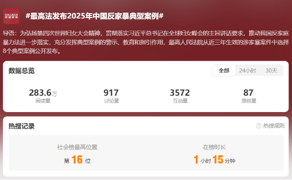 截至11月21日14時(shí),全網(wǎng)相關(guān)信息1.1萬余條?!?最高法發(fā)布2025年中國(guó)反家暴典型案例#”“#自殘威脅也是家庭暴力#”等微博話題閱讀量累計(jì)超5201.3萬。
