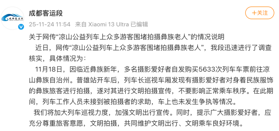 11月24日12時(shí)許,“@成都客運(yùn)段”發(fā)布情況說明稱,因臨近彝族新年,近日多名攝影愛好者乘坐5633次列車前往涼山彝族自治州。普雄站開車后,列車長(zhǎng)巡視車廂發(fā)現(xiàn)有攝影愛好者對(duì)身著民族服飾的彝族旅客進(jìn)行拍攝,遂對(duì)其進(jìn)行文明拍攝宣傳,不要影響正常乘車秩序。在此期間,列車工作人員未接到被拍攝者的求助,車上也未發(fā)生爭(zhēng)執(zhí)等情況。今后將加大列車巡視力度,加強(qiáng)文明出行宣傳。