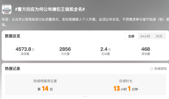 11月26日,義烏市公安局經(jīng)偵大隊民警接受媒體采訪時回應稱,“系犯罪嫌疑人個人作案,必須公布全名,不然集資參與者不知道他是誰”。網(wǎng)民普遍認可義烏警方的說法,認為警方回應質(zhì)疑維護透明執(zhí)法,批評部分媒體及自媒體“標題黨”行為。有媒體分析,從執(zhí)法的角度來看,警方的通告使用“王俊凱”全名于法有據(jù)、于理有因。畢竟,非法集資案件涉及眾多受害人,資金流向復雜,偵查過程需要最大程度地征集線索、固定證據(jù)。若僅用“王某某”這類模糊指代,確實會造成集資參與者無法準確識別、錯失報案時機,影響偵辦效率。