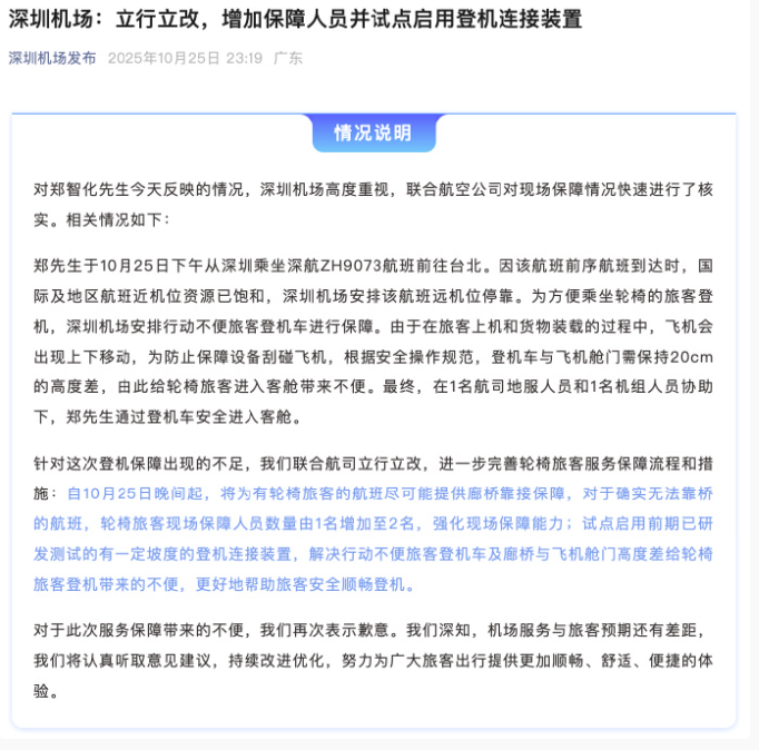 10月25日14時59分,中國臺灣歌手鄭智化通過微博賬號發(fā)文控訴其在深圳機場遭遇“不人性”對待:“操縱升降車的司機根本不顧我的安全,完全不愿把升降板提高,冷眼看著我連滾帶爬進飛機?!?小時后,相關話題出現在微博熱搜榜上,引發(fā)網民一致聲討涉事機場。當日18時許,深圳機場在該微博評論區(qū)留言致歉,表示已啟動核查,將以此為契機優(yōu)化特殊旅客的服務保障細節(jié)。23時許,深圳機場通過微信公眾號再發(fā)情況說明,稱將進一步完善廊橋靠接保障、人員增配等多項整改措施,更好幫助旅客安全順暢登機。