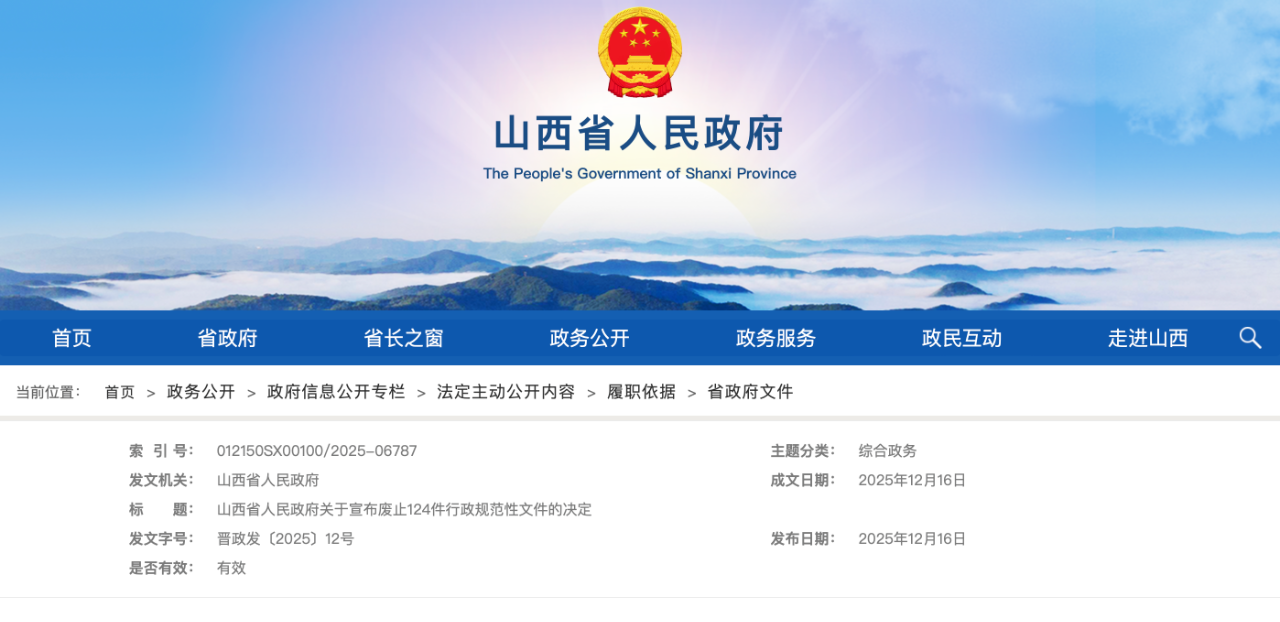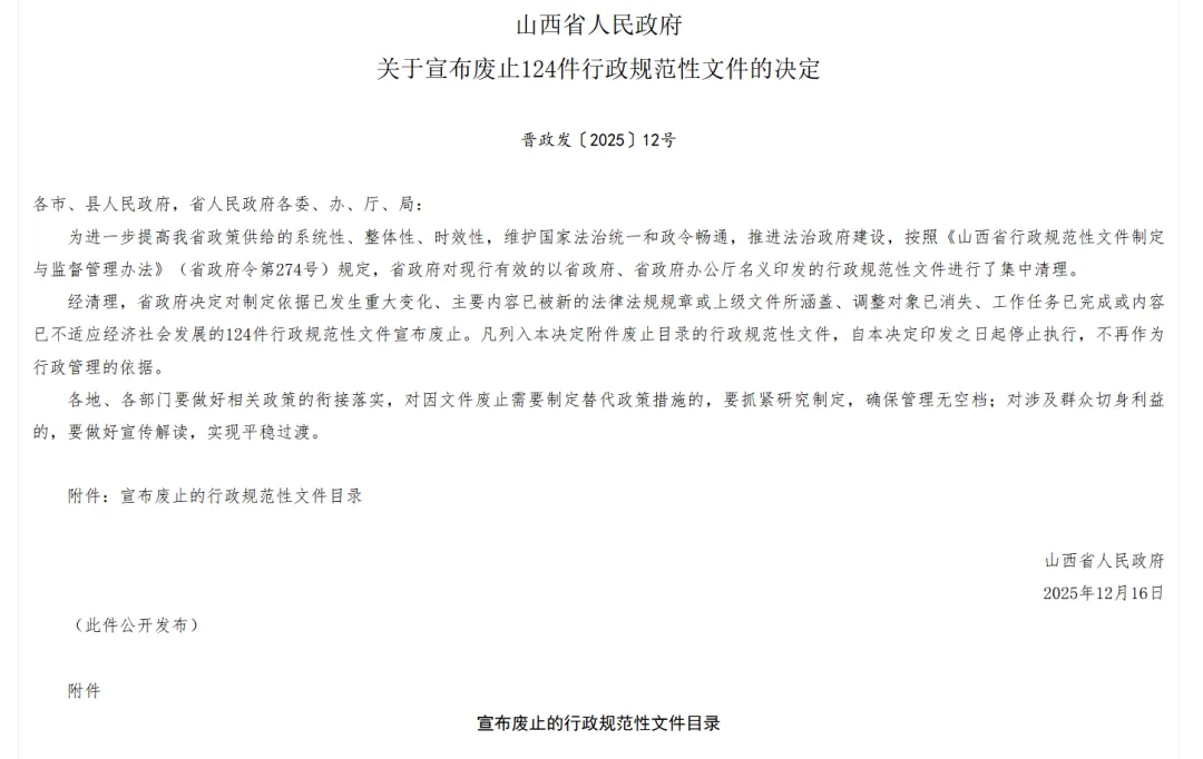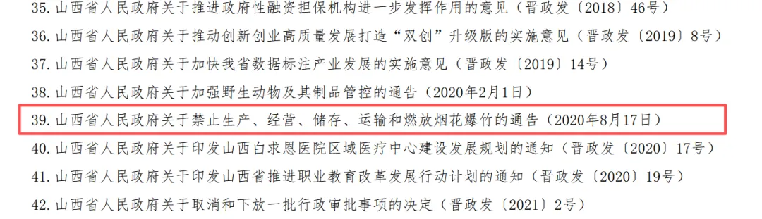12月16日,《山西省人民政府關(guān)于宣布廢止124件行政規(guī)范性文件的決定》公布,其中,2020年8月17日發(fā)布、同年10月1日起正式實(shí)施的《山西省人民政府關(guān)于禁止生產(chǎn)、經(jīng)營、儲存、運(yùn)輸和燃放煙花爆竹的通告》被納入廢止目錄,該通告自12月16日起停止執(zhí)行,不再作為行政管理依據(jù)。