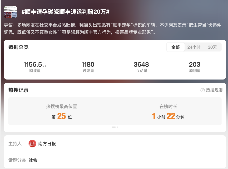 隨后,極目新聞、紅星新聞、上游新聞等媒體接力傳播,推高輿情熱度,微博話題“#順豐速孕碰瓷順豐速運(yùn)判賠20萬#”登上熱搜榜第25位。