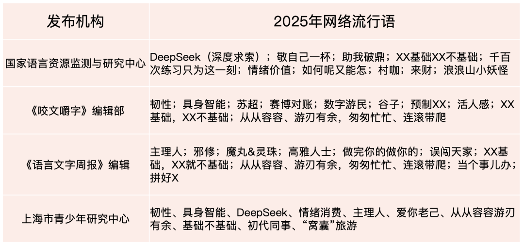 2025年12月,國家語言資源監(jiān)測與研究中心、《咬文嚼字》編輯部及《語言文字周報》編輯部相繼發(fā)布年度網絡流行語榜單。12月25日,上海市青少年研究中心立足青年群體視角,推出了“2025年度青年十大熱詞”。這些入選的流行語涵蓋科技、文化、消費等多個領域,其中“韌性”“DeepSeek”“具身智能”“從從容容游刃有余”等詞匯更是出現(xiàn)在不同機構的榜單上,呈現(xiàn)出高度重合性。它們不僅構成了一部由全民共同書寫的“情緒備忘錄”,也折射出當前傳播格局的演變與社會價值觀念的變遷。法治網輿情中心從使用主體、社會心態(tài)、傳播邏輯、行為趨向四個維度,對2025年網絡流行語展開深入解讀。