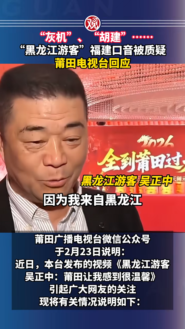 2月21日,福建莆田廣播電視臺為宣傳當(dāng)?shù)亍叭狡翁镞^大年”新春文旅活動,發(fā)布了一則視頻《黑龍江游客吳正中:莆田讓我感到很溫馨》。視頻中吳正中自稱黑龍江游客,稱“專程坐飛機(jī)11小時來莆田過年”,并盛贊當(dāng)?shù)睾ur和民俗。然而細(xì)心的網(wǎng)民發(fā)現(xiàn)其口音帶有典型的福建方言特征,如將“飛機(jī)”讀作“灰機(jī)”、“福建”讀作“胡建”,對其“東北人”的身份表示懷疑。