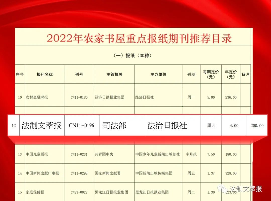 為深入學(xué)習(xí)宣傳貫徹習(xí)近平新時代中國特色社會主義思想,迎接黨的二十大勝利召開,指導(dǎo)各地做好2022年農(nóng)家書屋出版物補(bǔ)充更新工作,國家新聞出版署組織制定了《2022年農(nóng)家書屋重點出版物推薦目錄》。《推薦目錄》分重點圖書、重點報紙期刊、重點音像制品和電子出版物、重點少數(shù)民族文字圖書四類。《法制文萃報》成為重點報紙期刊推薦目錄中唯一一家法治類報紙。