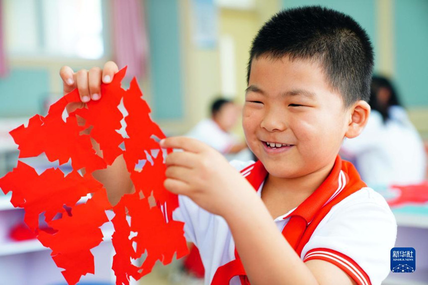 7月28日,在山東省齊河縣祝阿鎮(zhèn)馬坊社區(qū)鄉(xiāng)村“復興少年宮”,一名小朋友展示自己的剪紙。