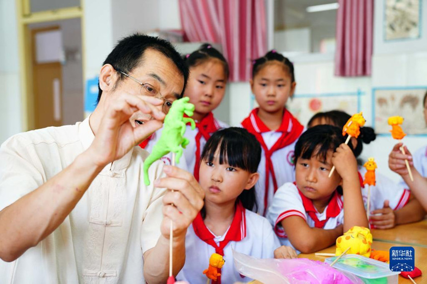 7月28日,在山東省齊河縣祝阿鎮(zhèn)馬坊社區(qū)鄉(xiāng)村“復興少年宮”,王向東在教小朋友捏面塑。