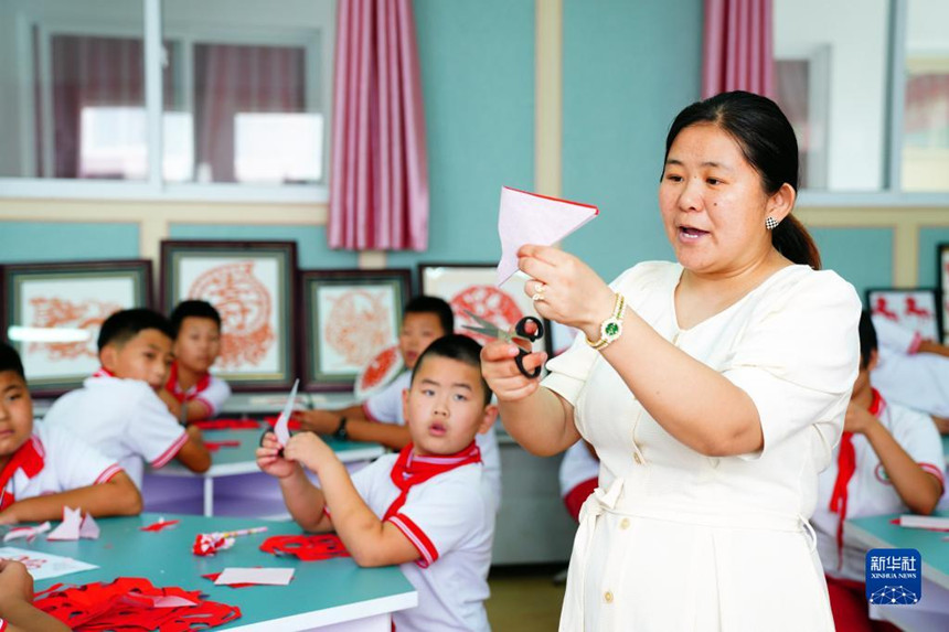 7月28日,在山東省齊河縣祝阿鎮(zhèn)馬坊社區(qū)鄉(xiāng)村“復興少年宮”,孫春華在教小朋友剪紙。