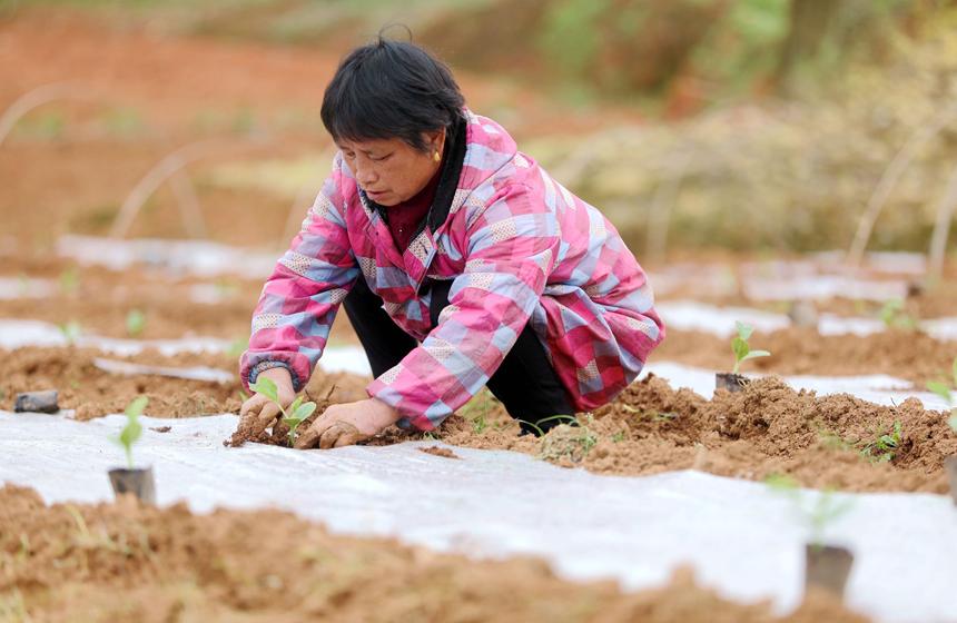 2月28日,江西省宜春市上高縣墨山鄉(xiāng)香山村蔬菜種植基地,菜農(nóng)正在種植蔬菜。近年來,在政策扶持和農(nóng)業(yè)技術(shù)支持下,該村大力發(fā)展黃土地蔬菜種植,黃瓜、苦瓜、豆角、茄子等綠色蔬菜銷往全國(guó)多地,讓當(dāng)?shù)夭宿r(nóng)在家門口就業(yè)增收。