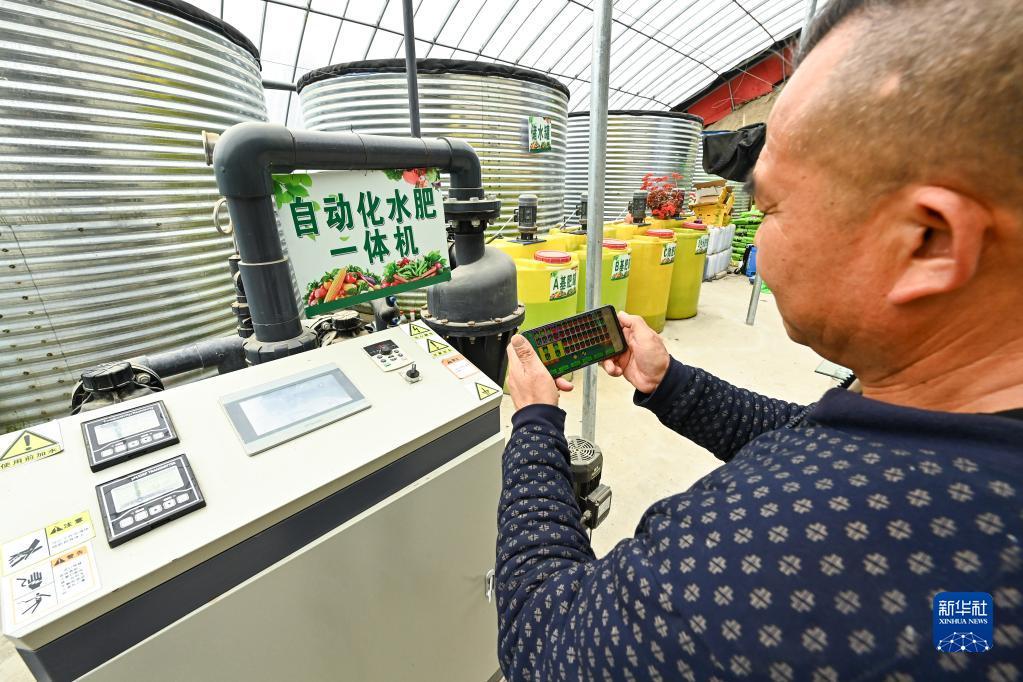 現(xiàn)代設(shè)施農(nóng)業(yè)示范基地的管理人員通過手機(jī)控制自動(dòng)化水肥一體機(jī)。記者 丁磊 攝