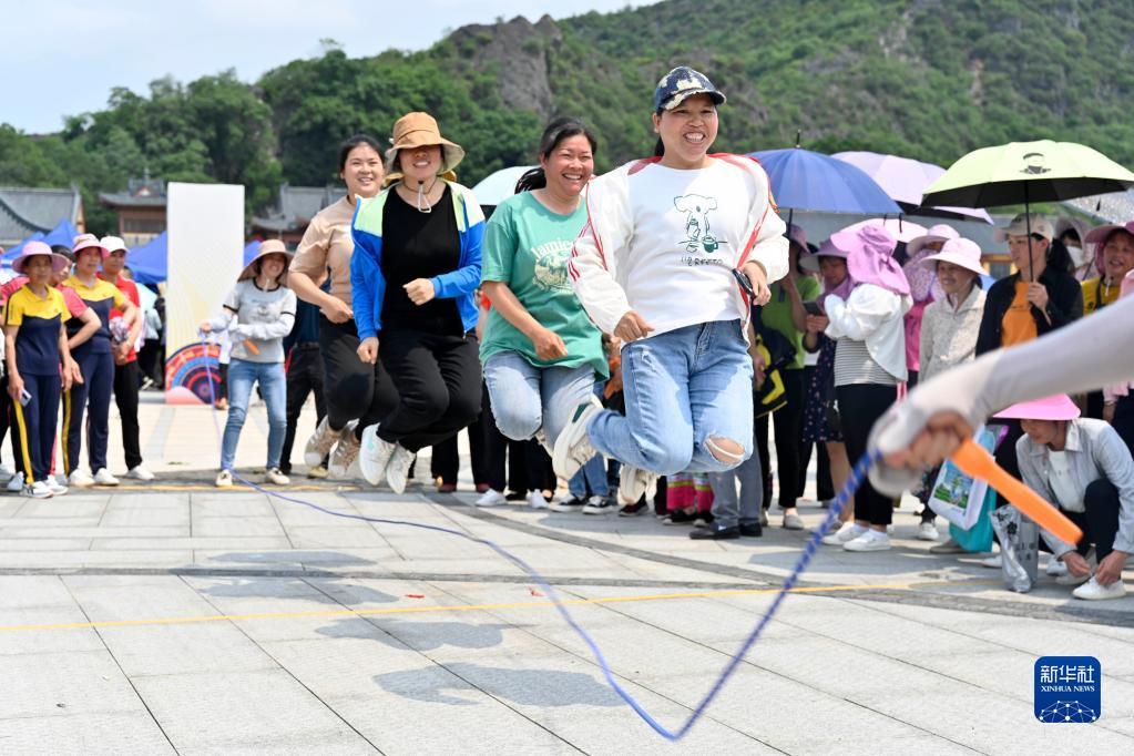 4月20日,在柳城縣鳳山鎮(zhèn)鳳鳴廣場(chǎng),村民在跳繩。黎寒池 攝