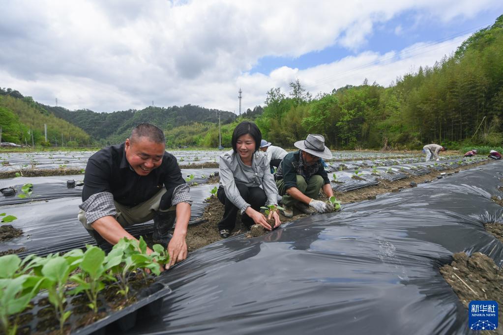 4月20日,返鄉(xiāng)創(chuàng)業(yè)人才俞冬紅(中)在位于臨安區(qū)昌化鎮(zhèn)后營(yíng)村的蔬菜基地與農(nóng)戶(hù)交流。記者 徐昱 攝