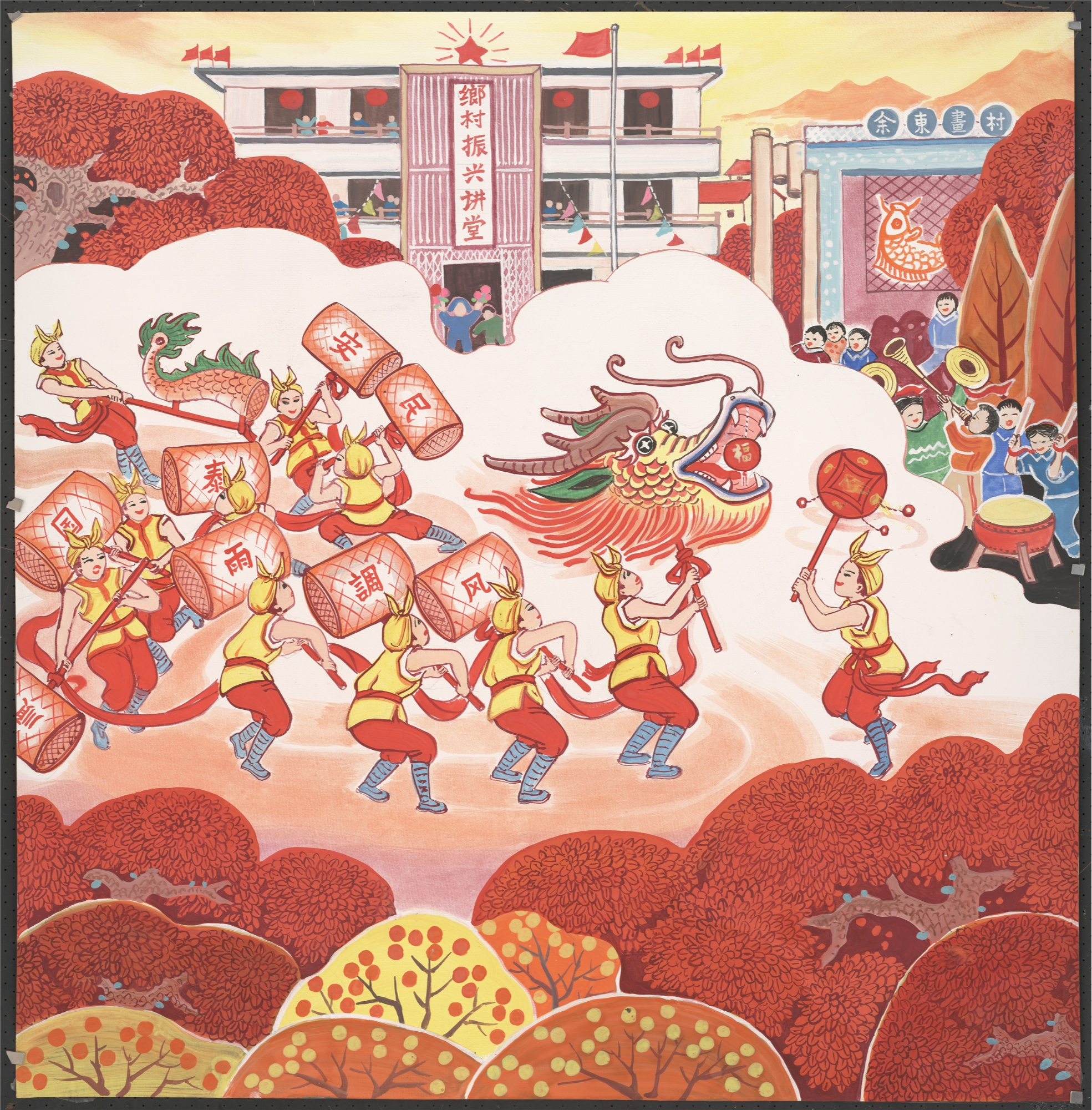 農(nóng)民畫家鄭根良創(chuàng)作的《余東舞龍》農(nóng)民畫(余東村供圖)