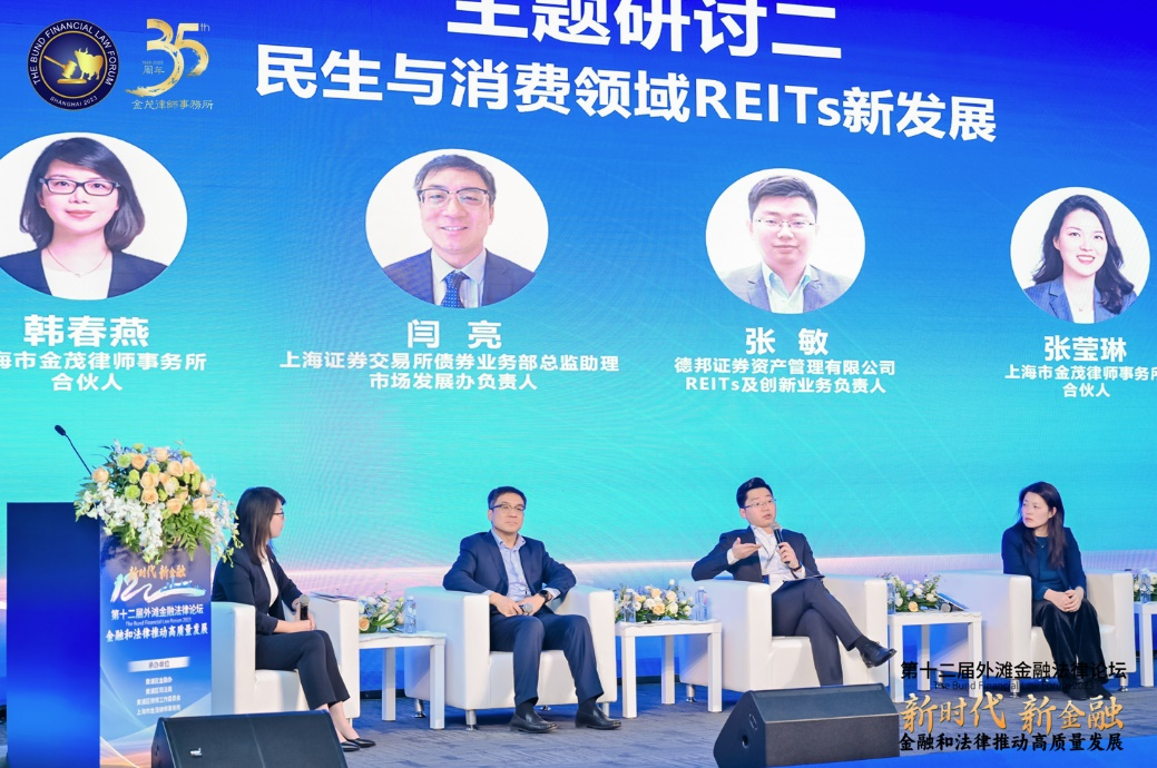 “民生與消費(fèi)領(lǐng)域REITs新發(fā)展”主題研討環(huán)節(jié),由上海市金茂律師事務(wù)所合伙人韓春燕律師主持,來自上海證券交易所債券業(yè)務(wù)部總監(jiān)助理、市場發(fā)展辦負(fù)責(zé)人閆亮先生、德邦證券資產(chǎn)管理有限公司REITs及創(chuàng)新業(yè)務(wù)負(fù)責(zé)人先生、上海市金茂律師事務(wù)所合伙人張瑩琳律師共同參與研討。
