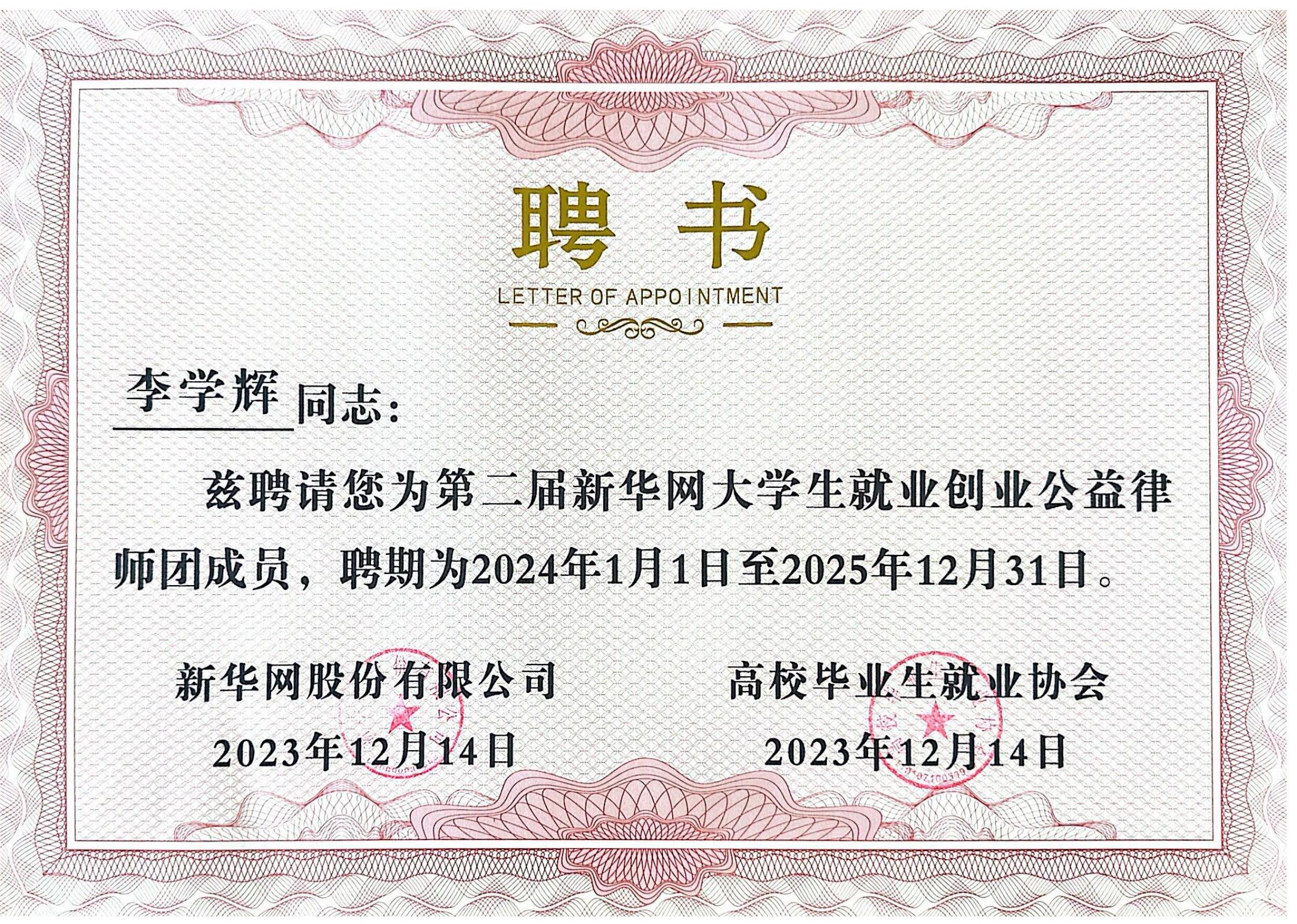 北京市安理律師事務(wù)所黨委副書記、管委會(huì)委員李學(xué)輝律師憑借扎實(shí)的法律功底、過(guò)硬的專業(yè)素養(yǎng)、應(yīng)有的責(zé)任擔(dān)當(dāng),受聘擔(dān)任新華網(wǎng)大學(xué)生就業(yè)創(chuàng)業(yè)公益律師團(tuán)成員。