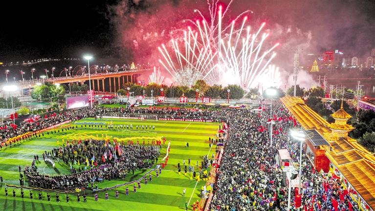 19時(shí)30分,澳門職工聯(lián)隊(duì)與貴州村超聯(lián)隊(duì)友誼賽結(jié)束后,“村超村晚”文藝展示又將整場(chǎng)活動(dòng)推向高潮。這場(chǎng)晚會(huì)由民風(fēng)民俗展新顏、鄉(xiāng)村足球超快樂、貴山貴水迎貴客、龍騰盛世慶豐年4個(gè)篇章組成,參演演員近2300人。據(jù)相關(guān)負(fù)責(zé)人介紹,此次文藝展示的內(nèi)容均以榕江“村超”自創(chuàng)節(jié)目為主,同時(shí),澳門舞醉龍表演隊(duì)在龍騰盛世慶豐收環(huán)節(jié)與貴州的舞龍隊(duì)伍共同演出,展示出兩地文化的互通互融。本次文藝展示強(qiáng)調(diào)“草根”和民族文化,吸引了上萬人現(xiàn)場(chǎng)觀看,在演出的尾聲,一場(chǎng)持續(xù)10余分鐘的煙花秀點(diǎn)亮了榕江縣的夜空,“文化味、民族味、傳承味、年味”十足的“村超村晚”在觀眾和游客的掌聲與歡呼聲中落下帷幕。