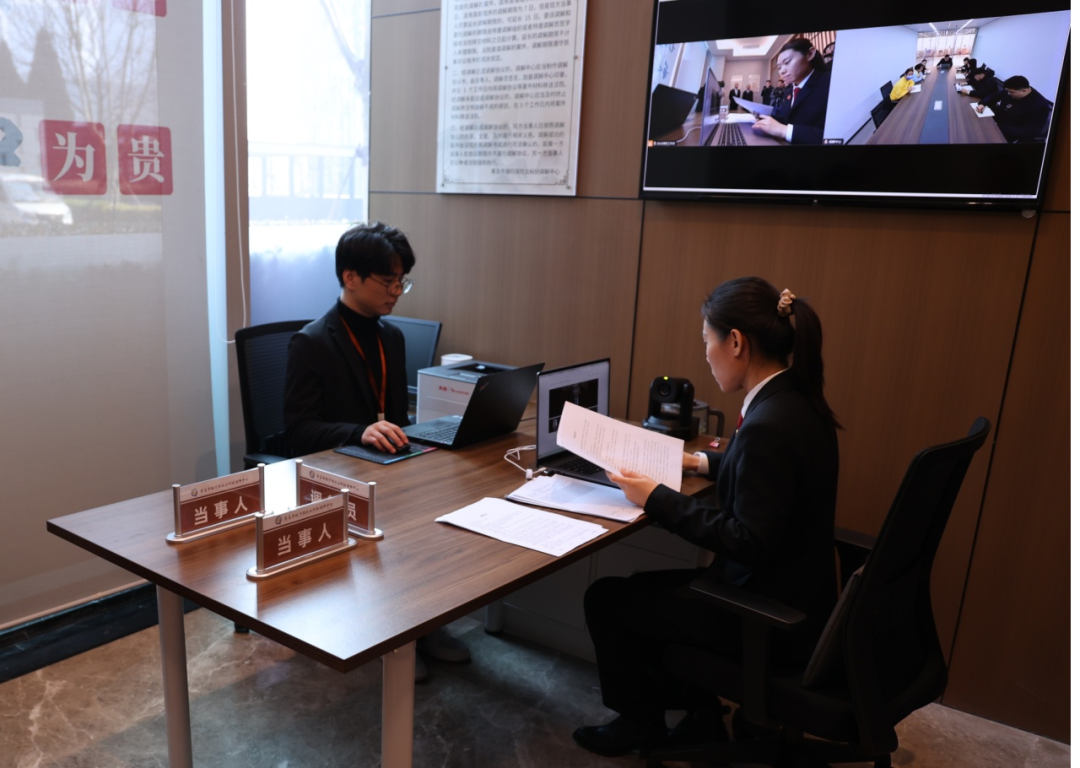 揭牌儀式后,共建單位參觀考察了“金法E站”運(yùn)行情況,并共同見證了一起金融糾紛的高效化解。調(diào)解人員通過“金法E站”調(diào)解平臺(tái)進(jìn)行線上調(diào)解,法官現(xiàn)場(chǎng)出具并送達(dá)司法確認(rèn)書,展現(xiàn)了高效、便捷、智能的金融糾紛化解新模式。