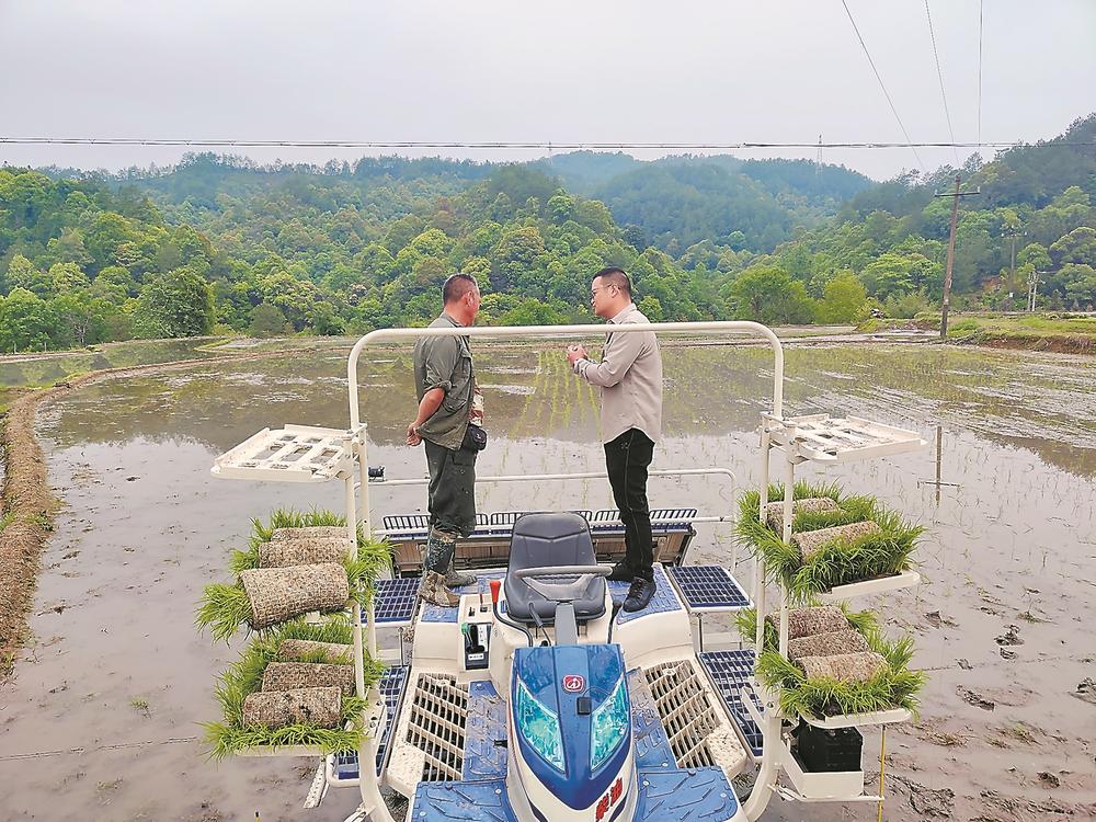 三明市清流縣的農(nóng)戶在新型插秧機上交流插秧事宜(資料圖片)