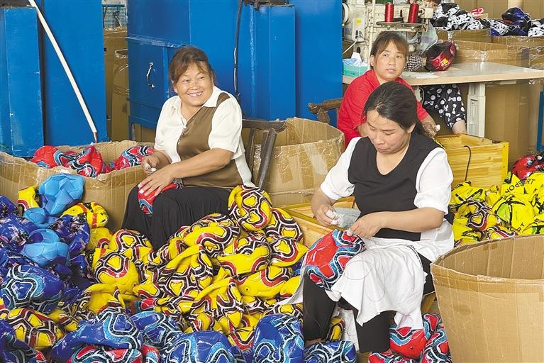 7月4日,在陜西省安康市漢陰縣平梁鎮(zhèn)興隆佳苑社區(qū)工廠,50多名女工緊張忙碌著。經(jīng)過(guò)裁剪、縫制、檢測(cè)等一道道工序,5000個(gè)足球下線,從大山深處走向市場(chǎng)。