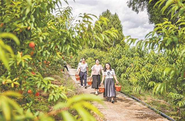 5月20日,大足區(qū)智鳳街道福壽社區(qū)的生態(tài)果園,市民采摘桃子,滿載而歸 通訊員 黃舒 攝