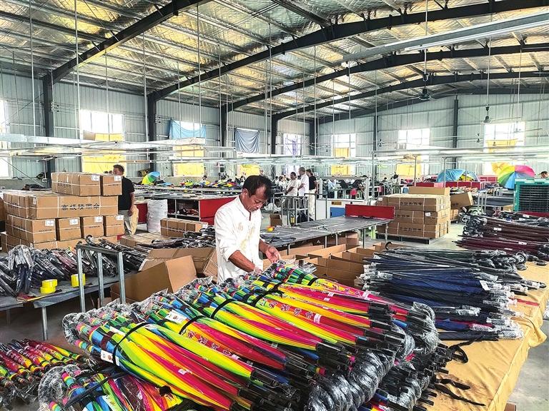 2021年6月至2023年12月,該鎮(zhèn)以點帶面、擴大規(guī)模、提升產(chǎn)能,以管理區(qū)為單位建立規(guī)模廠,以村為單位建立加工工坊,以家庭為單位建立加工戶,把適合家庭生產(chǎn)的加工環(huán)節(jié)更多地延伸到農(nóng)戶家中,推動產(chǎn)業(yè)規(guī)??焖贁U大。目前,全鎮(zhèn)利用村閑置村部、學校、廠房、民宅等建成規(guī)模廠11家、制傘工坊20個、加工戶1000多戶,培育4個自主品牌,幾十個品種,上百款樣式,年產(chǎn)雨傘2000萬把、傘架4000萬支,年產(chǎn)值5億多元,帶動就業(yè)2000余人。真正把產(chǎn)業(yè)鏈實體留在縣域,將更多就業(yè)崗位留在鄉(xiāng)村,帶動群眾在家門口就近就便就業(yè)、就地城鎮(zhèn)化,養(yǎng)老帶小、上班掙錢、農(nóng)忙種地“三不誤”。