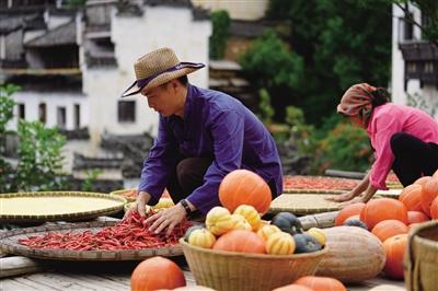 穿上傳統(tǒng)的農(nóng)民服飾,吳仙鳳每天用農(nóng)作物作畫,為游客表演篩辣椒、晾南瓜,這取代務(wù)農(nóng)成了她的主業(yè),隨著越來越多的游客來到篁嶺,吳仙鳳的收入也越來越高。