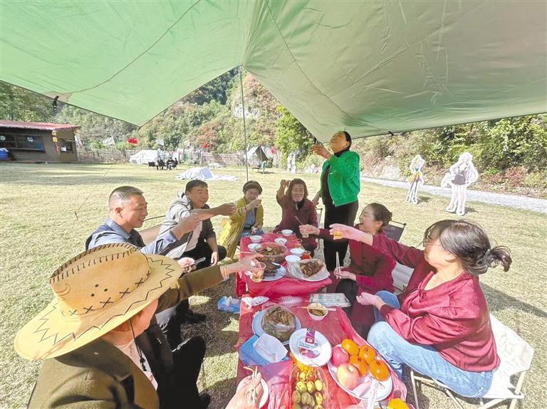 “我們的戶外特色帳篷‘星象’,一到節(jié)假日就得早早預(yù)訂?!鄙耠[谷露營基地負責(zé)人胡桃根說,今年前10月,露營基地共接待游客10萬人次,帶動周邊20多名村民就業(yè)增收,也讓村里的特色農(nóng)產(chǎn)品賣上了好價錢。