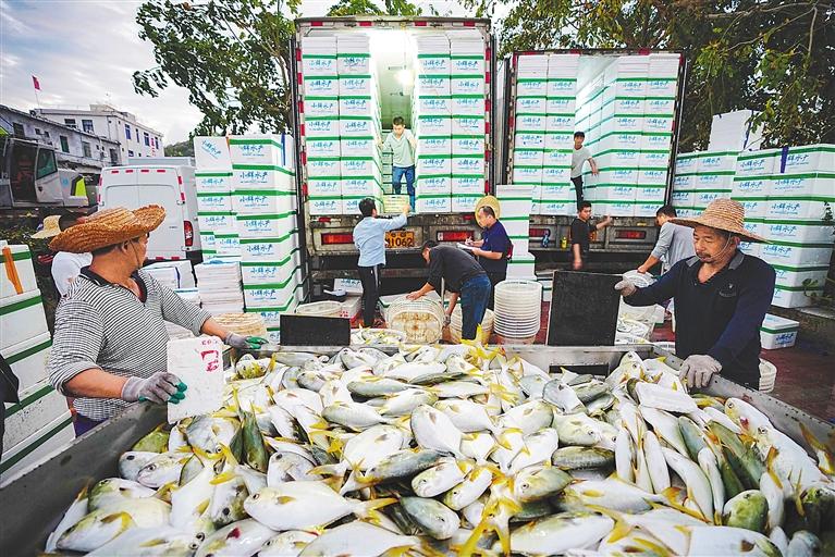 崖州灣首批深海網(wǎng)箱養(yǎng)殖的金鯧魚上市銷售 王將就 攝