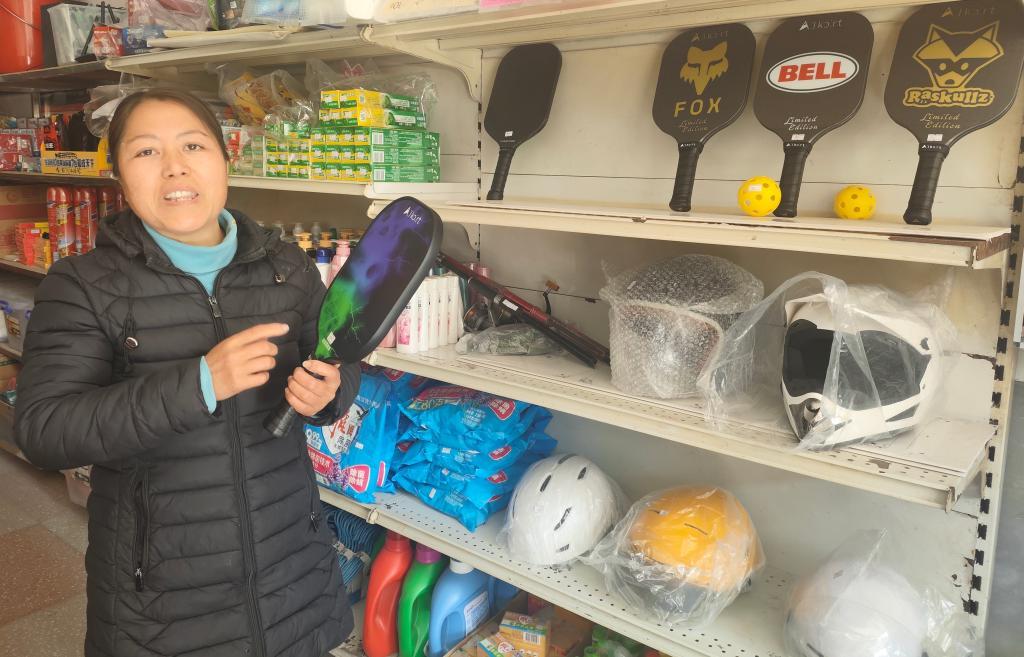 在贛州市上猶縣陡水鎮(zhèn)月仔村,村民曾七鳳正在介紹自家雜貨店的匹克球拍。記者 姚子云 攝