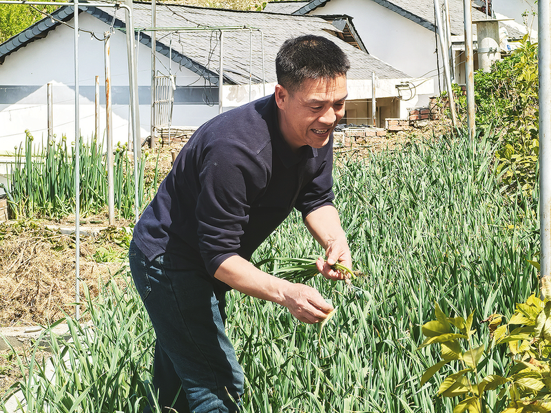 4月9日,曹義軍正在自家菜園采摘蔬菜。