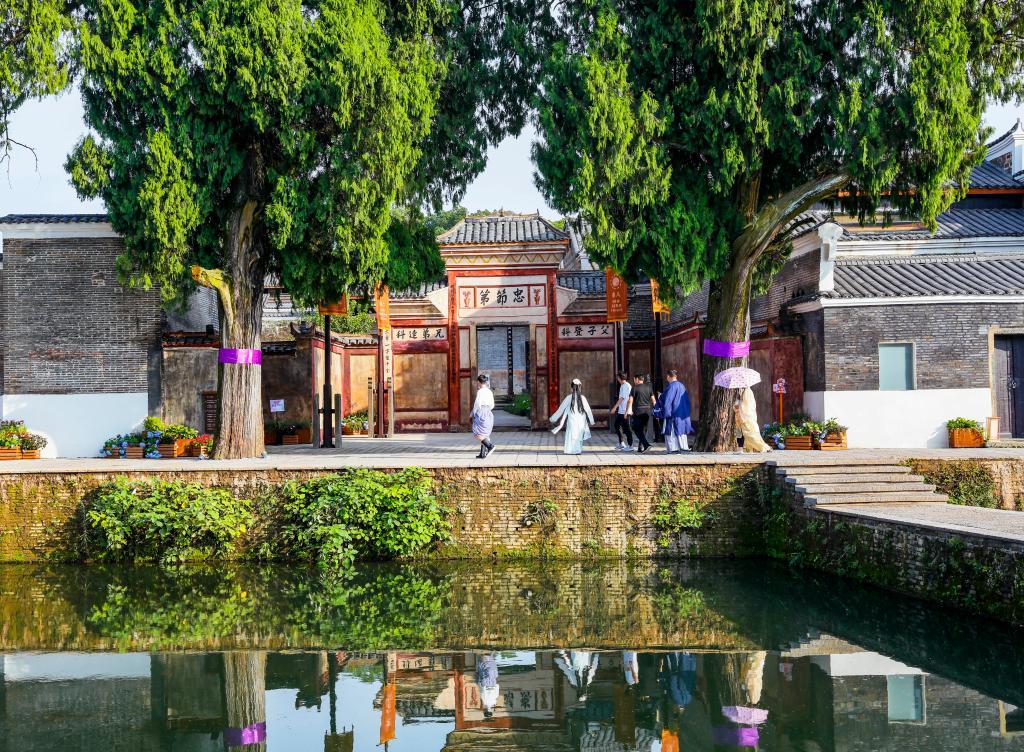 吉安古稱廬陵,釣源古村因歷史上交通便利、物阜民豐,鼎盛時期被稱為廬陵“小南京”。從高處俯瞰,古村規(guī)劃根據(jù)地勢高低順勢而為,以八卦布局,疏密有致、移步換景。村內(nèi)有150棟明清贛派建筑,道路整潔、流水清澈,青磚黛瓦被2.6萬余棵古樟樹環(huán)繞。
