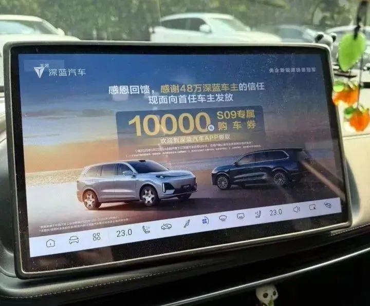 日前,多位深藍(lán)汽車(chē)車(chē)主公開(kāi)吐槽稱,深藍(lán)汽車(chē)在沒(méi)經(jīng)過(guò)車(chē)主同意的情況下在汽車(chē)中控大屏幕投放廣告。廣告顯示“感謝48萬(wàn)深藍(lán)車(chē)主的信任,現(xiàn)面向首任車(chē)主發(fā)放10000元專屬購(gòu)車(chē)券”。