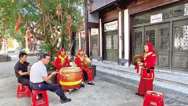 在長(zhǎng)安鎮(zhèn)長(zhǎng)安茶城洪家大院,每周都有不同的文化活動(dòng)輪番上演。這座始建于1806年的老宅,曾是當(dāng)?shù)睾樾占易宓淖嫖荩?013年修繕后成為長(zhǎng)安鎮(zhèn)文共體分中心所在地。如今,這里設(shè)有弦子腔非遺展廳、情景劇場(chǎng)、烙畫傳習(xí)基地、閱覽室等功能區(qū)域,全天免費(fèi)開放,成為群眾文化生活的“打卡地”。